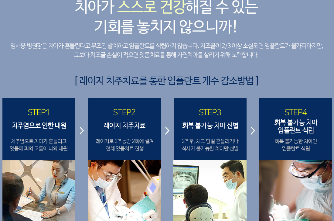 - "임플란트 환자의 부담요소(비용, 기간, 통증, 부작용)를 줄인 치료 노하우입니다."