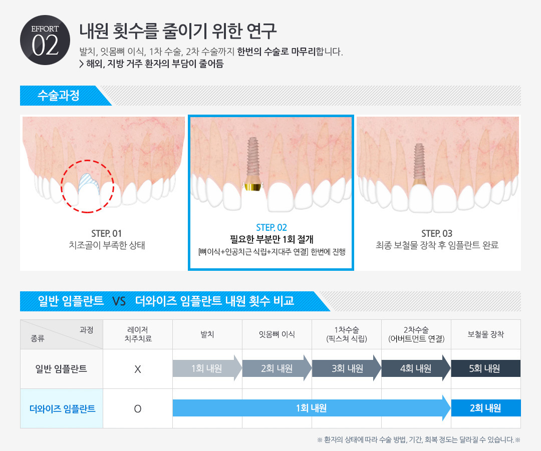 - "임플란트 환자의 부담요소(비용, 기간, 통증, 부작용)를 줄인 치료 노하우입니다."