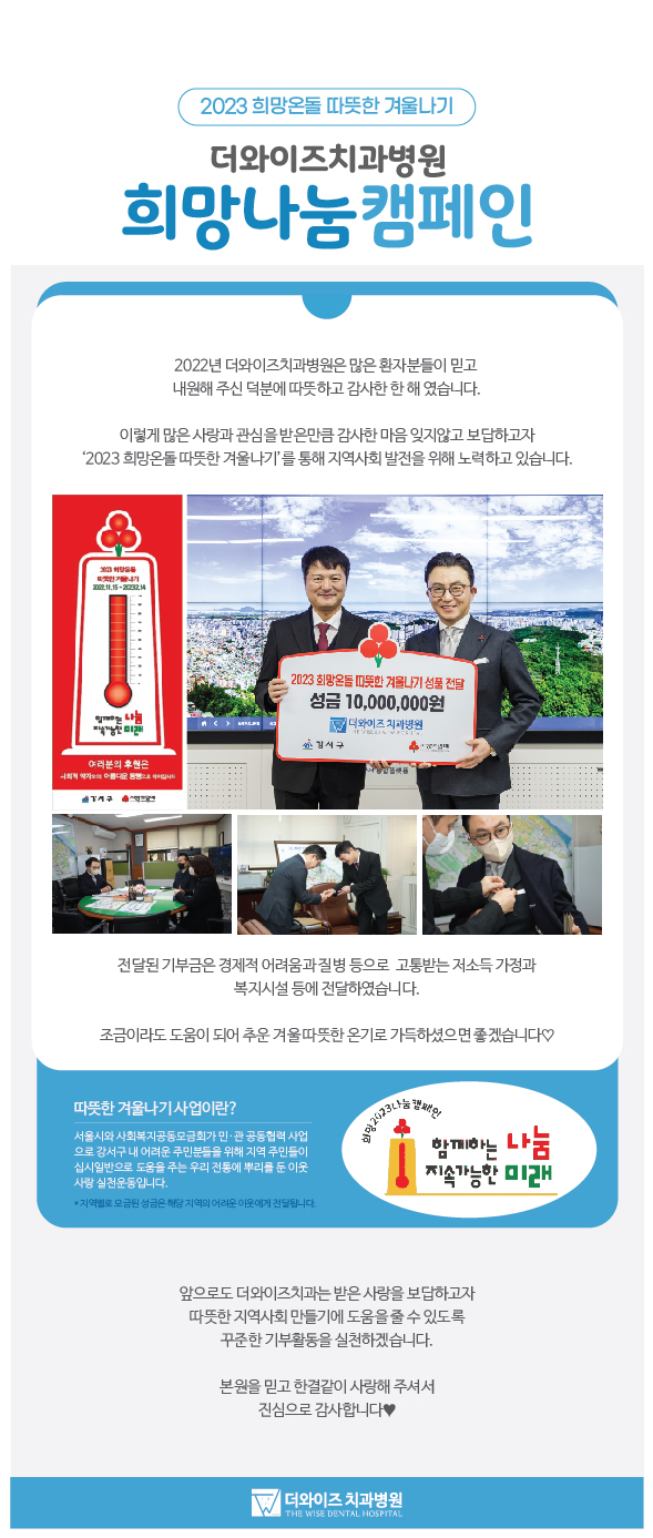 ![]() 2022년 더와이즈치과병원은 많은 환자분들이 믿고 내원해 주신 덕분에 따뜻하고 감사한 한 해 였습니다. 이렇게 많은 사랑과 관심을 받은만큼 감사한 마음 잊지않고 보답하고자 '2023 희망온돌 따뜻한 겨울나기'를 통해 지역사회 발전을 위해 노력하고 있습니다. 전달된 기부금은 경제적 어려움과 질병 등으로 고통받는 저소득 가정과 복지시설 등에 전달하였습니다. 조금이라도 도움이 되어 추운 겨울 따뜻한 온기로 가득하셨으면 좋겠습니다♡ 앞으로도 더와이즈치과는 받은 사랑을 보답하고자 따뜻한 지역사회 만들기에 도움을 줄 수 있도록 꾸준한 기부활동을 실천하겠습니다. 본원을 믿고 한결같이 사랑해 주셔서 진심으로 감사합니다♥ |