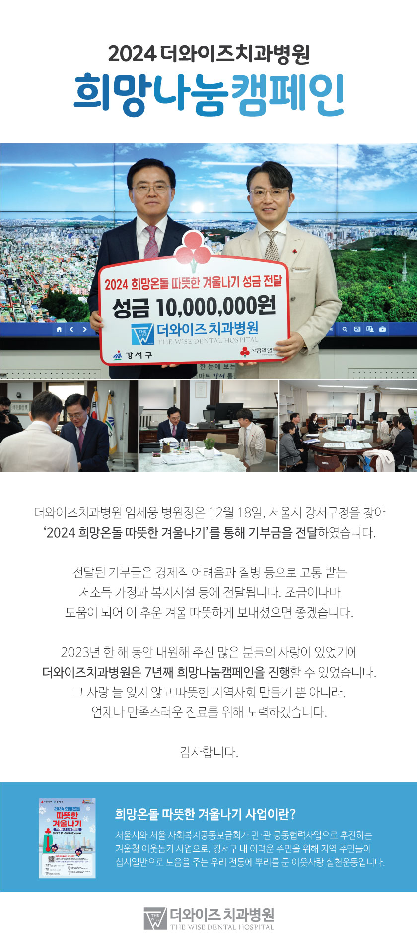 ![]() 더와이즈치과병원 임세웅 병원장은 12월 18일, 서울시 강서구청을 찾아 ‘2024 희망온돌 따뜻한 겨울나기”를 통해 기부금을 전달하였습니다. 전달된 기부금은 경제적 어려움과 질병 등으로 고통 받는 저소득 가정과 복지시설 등에 전달됩니다. 조금이나마 도움이 되어 이 추운 겨울 따뜻하게 보내셨으면 좋겠습니다. 2023년 한 해 동안 내원해 주신 많은 분들의 사랑이 있었기에 더와이즈치과병원은 7년째 희망나눔캠페인을 진행할 수 있었습니다. 그 사랑 늘 잊지 않고 따뜻한 지역사회 만들기 뿐 아니라, 언제나 만족스러운 진료를 위해 노력하겠습니다. 감사합니다. |
