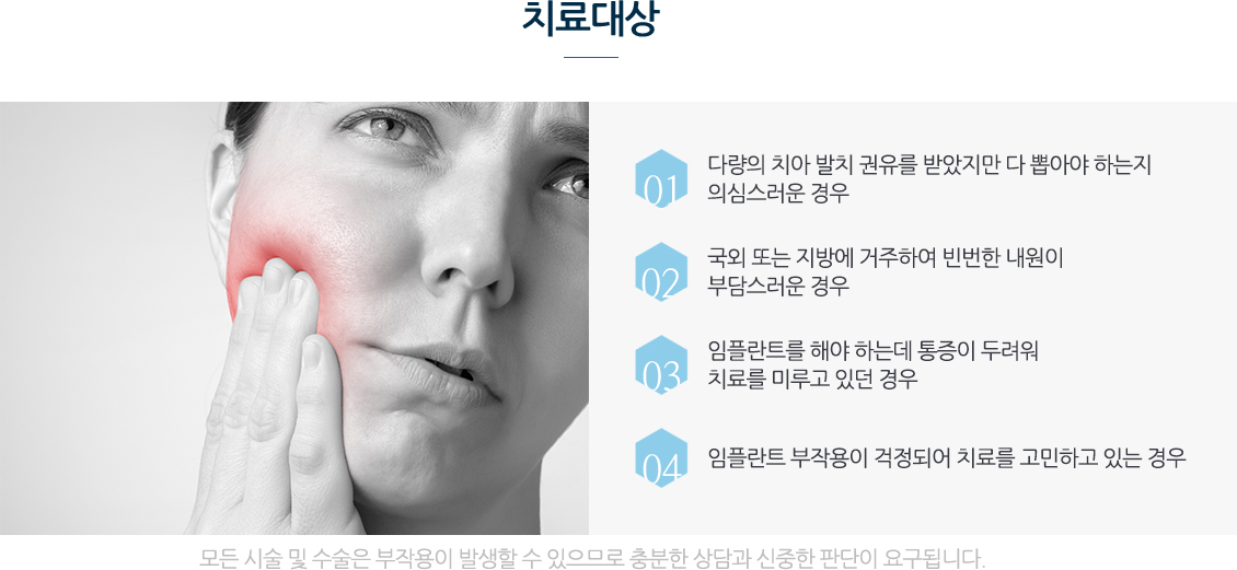 - "임플란트 환자의 부담요소(비용, 기간, 통증, 부작용)를 줄인 치료 노하우입니다."